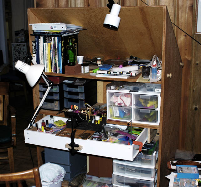 This cabinet is actually a set of shelves on wheels that fits under the stairs. Notice the way the top slopes back? After sufficient abuse I can take off the lights, clean up a bit and slide the drawer in, then open the hidden door under the stairs and hide the whole thing.
